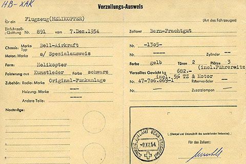 | HB-XAK customs clearance paper - Photo Flugarchiv Graubünden © 9-Dec-54 | HB-XAK of Heliswiss at Limmernfirn - Photo by H.B.Burgunder via Roland Küng © 1955 |