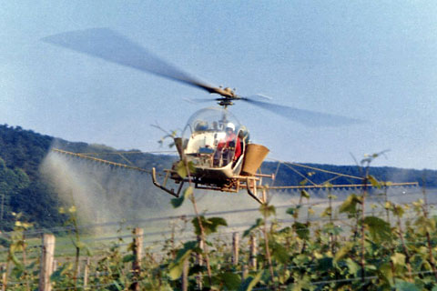 HB-XAV of Heliswiss in England with advertising boards - Photo courtesy by NA3T © 1960s - NA3T | HB-XAV of Heliswiss during spraying ops in old blue colors - Photo Archive Pierre Fuellemann © 1960s |