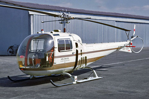 HB-XBX of Heliswiss at Bern in the first white-golden livery - Photo by Peter Aegerter © 1964 | HB-XBX of Heliswiss at Bern-Belp - Photo collection Werner Häuselmann © 1964 |