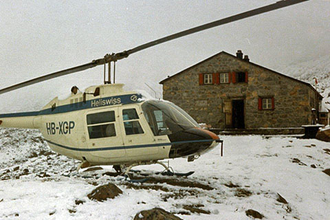 | HB-XCP the 1st Heliswiss Jet Ranger at Bern-Belp - Photo by Paul Schuepbach © Aug-68 | HB-XCP of Heliswiss in the original livery at Es-cha Cabin - Photo by Roland Küng © 1970 |