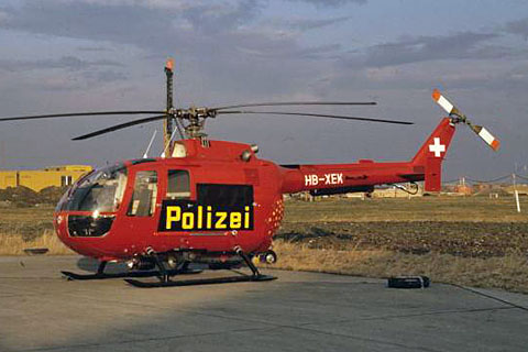 HB-XEK of SRFW during a mountain mission - Photo by MBB Archive Michael Mau © 1974 | HB-XEK of Swiss Air Ambulance with Polizei titles at Basel - Photo Markus Herzig Collection © Mar-75 |