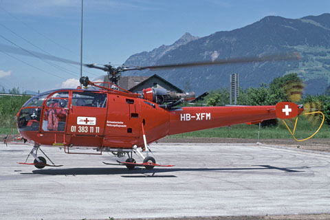 | HB-XFM of Swiss Air Ambulance at Bern with Pax100 sticker - Photo by Paul Schüpbach © 24-Sep-76 | HB-XFM of Swiss Air Ambulance at Erstfeld in new colors - Photo by Markus Herzig © 21-Jun-91 |