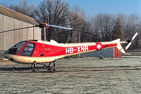 | HB-XNR of Kern AG at Bern-Belp - Photo by Markus Herzig © 28-Nov-89 | HB-XNR of Rotorcraft Ltd with red skids at Bern-Belp - Photo by Markus Herzig © 23-Dec-93 |