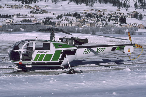 | HB-XOT of Rhein-Helikopter AG at Samedan - Photo by Werner Häuselmann © 14-Feb-88 |