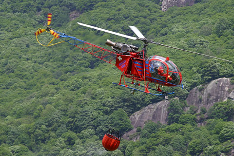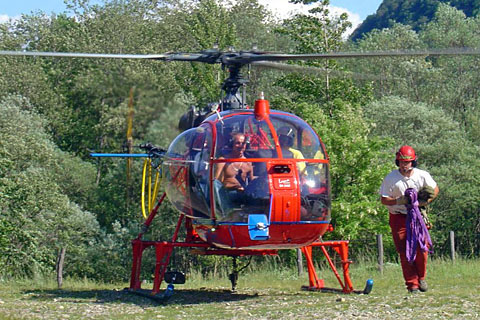 HB-XPY of Heli-TV SA at Lodrino with a full loaded bambi bucket - Photo by Michele Ceresa © Jul-03 | HB-XPY of Heli-TV SA picking up ground crew in Valle Maggia - Photo by Madian Minoggio © Mar-05 |