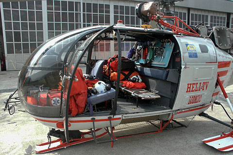 HB-XQN of Heli-TV at Lodrino, ready for the next rescue flight - Photo by Michele Ceresa © Jul-03 | HB-XQN at Cardada Cimetta rescue pad above Locarno - Photo by Alberto Urietti © 14-Feb-04 |