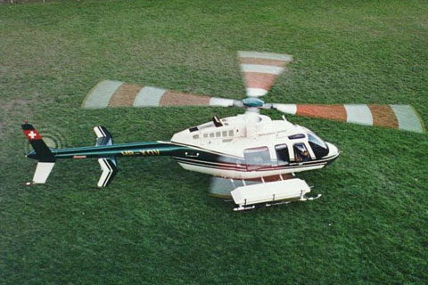| HB-XQV of Hélicoptère Service SA at Bern-Belp - Photo by Markus Herzig © 8-Jul-98 | HB-XQV of Hélicoptère Service SA at Chamoson football place - Photo by Reynold Favre © Aug-01 |