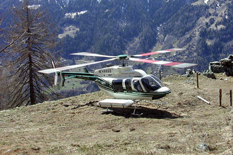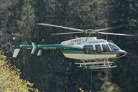| HB-XQV of Hélicoptère Service at Montreux for a transport - Photo by Geneviève Guérite © 11-Apr-05 | HB-XQV of Hélicoptère Service SA at work - Photo by Joel Bessard © 29-Apr-05 |