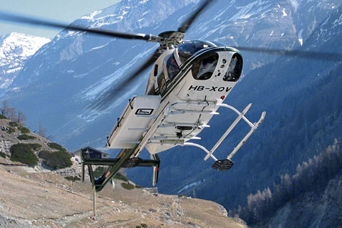 | HB-XQV of Hélicoptère Service SA during a short stop over - Photo by Grégoire Praz © 2001 | HB-XQV of Hélicoptère Service SA approaching Zermatt - Photo by Stephane Raymond © Apr-03 |