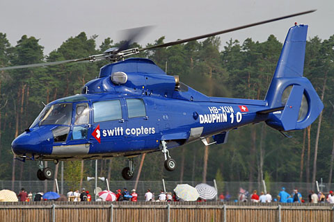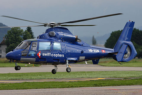 HB-XQW as 'Dauphin 10' at Formula 1 race in Hockenheim - Photo by Elisabeth Klimesch © 25-Jul-04 | HB-XQW of Swift Copters at Bern-Belp - Photo by Markus Herzig © 9-Jun-08 |