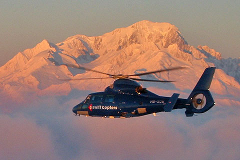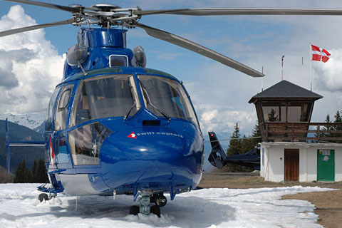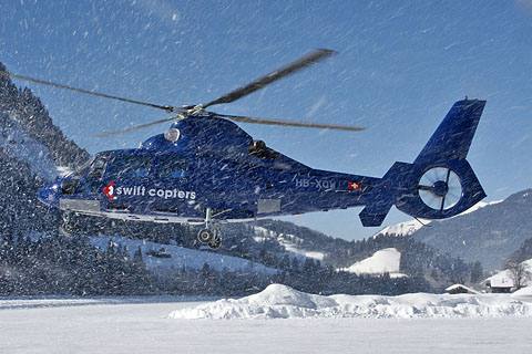 HB-XQW of Swift Copters cruising in front of Mont-Blanc - Photo by Swift Copters © Dec-02 | HB-XQW departing from the snowy ramp at Saanen - Photo by Markus Herzig © 15-Feb-03 - MHP |