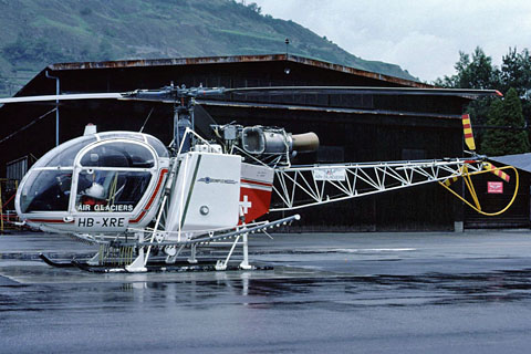 | HB-XRE in the first Air Glaciers SA livery at SIon - Photo by Werner Haeuselmann © 19-Jun-87 | HB-XRE of Air Glaciers SA during forest firefighting at Vercorin - Photo by Reynold Favre © 18-Mar-02 |