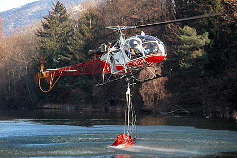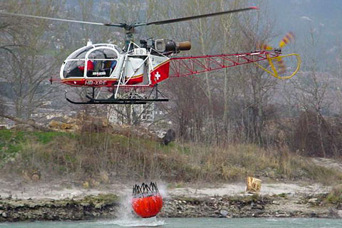 | HB-XRE of Air Glaciers SA in the region of Ovronnaz on 2'200m - Photo by Joel Bessard © 15-Jan-03 | HB-XRE of Air Glaciers SA during forest firefighting at Montorges - Photo by Julien Ritz © 17-Mar-04 |