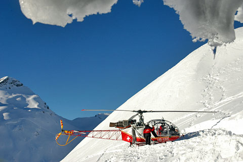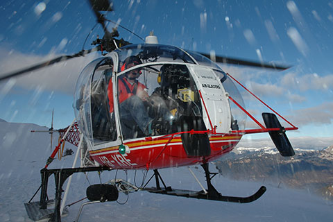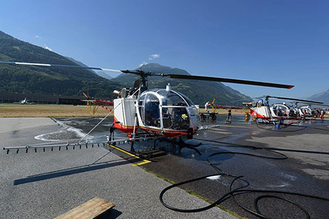 | HB-XRE of Air Glaciers SA at Sion during cleaning after spraying - Photo by Joel Bessard © Jul-15 | HB-XRE of Air Glaciers SA in downwash snow - Photo by Stefan Brügger © Dec-18 |
