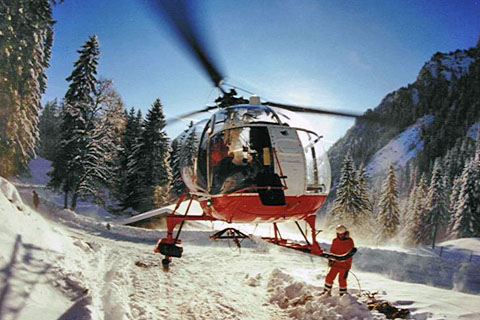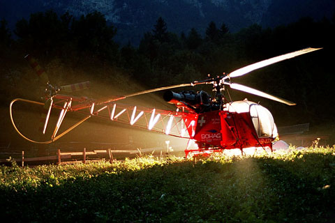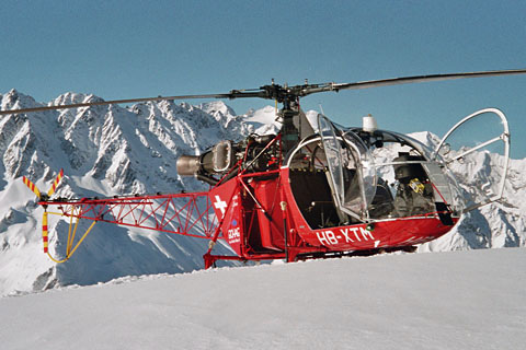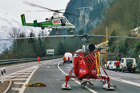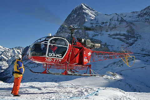 | HB-XTM of BOHAG at Gsteigwiler after the pre flight check - Photo by Adrian Rösti © Aug-05 | HB-XTM of BOHAG landing at Lauberhorn helipad - Photo by Markus Herzig © 13-Jan-06 |