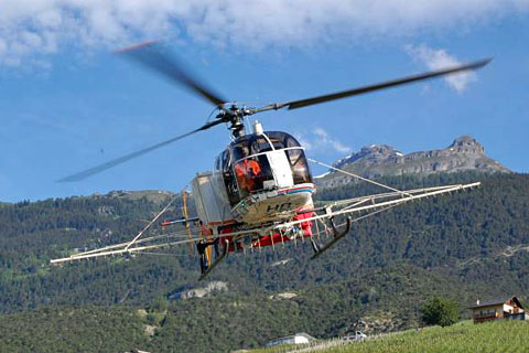 HB-XTN of Trans-Heli SA during spraying ops at Miège - Photo by Reynold Favre © 1-Jun-09 |