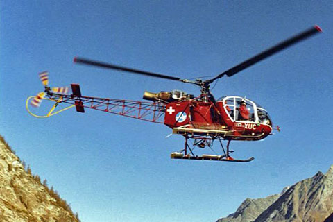 | HB-XUC of Air Zermatt above the heliport at Zermatt - Photo by Adrian Roesti © 10-Dec-89 |