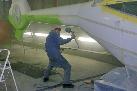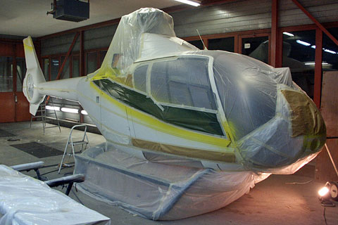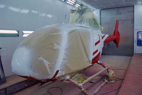 | HB-ZDS of Swiss Helicopter AG during repainting by Remund AG - Photo by Remund © 2-May-13 | HB-ZDS of Swiss Helicopter AG at Büchslen repainted by Remund AG - Photo by Remund © 3-May-13 |