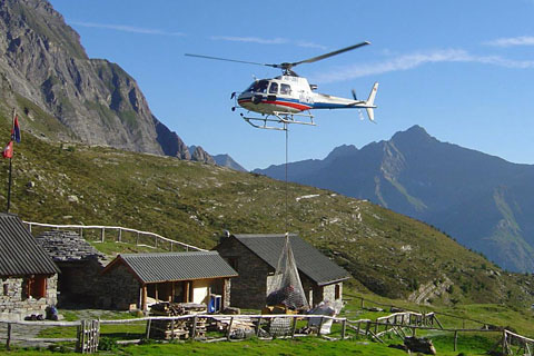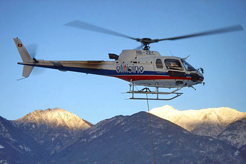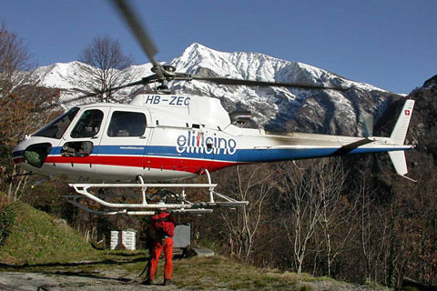 | HB-ZEC of Eliticino SA at Viareggio on a roof helipad - Photo by Gianni Testa © 31-May-02 | HB-ZEC now with full Eliticino titles in scenic Val Cama - Photo by Gianni Testa © Sep-02 |