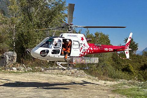 | HB-ZIA of Air-Glaciers SA in new company livery at Sion - Photo by Joel Bessard © 15-Jul-24 | HB-ZIA returning from the first rescue mission in new colors - Photo by Joel Bessard © 1-Aug-24 |