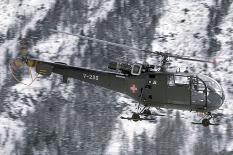 V-233 during takeoff from Samedan - Photo by Markus Herzig © 1-Feb-99 | Former V-233 of Swiss Air Force displayed at Unteriberg - Photo by Martin Dällenbach © 4-Aug-15 |