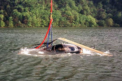 | V-267 at Bex during the Heli-Cup - Photo by Werner Häuselmann © 21-Aug-87 | V-267 of Swiss Air Force crashed into Alpnachersee - Photo Flugarchiv Graubünden © May-91 |