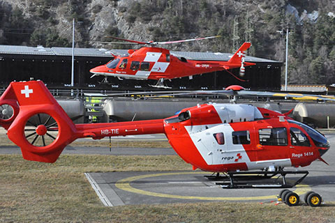 | HB-ZEF and HB-XOE (2) of Air-Glaciers SA at Sion hospital - Photo by Gregory Murmann © 8-Feb-26 | HB-TIE and HB-ZRU of Rega at Locarno-Magadino - Photo by Marco Carcano © 17-Feb-26 |