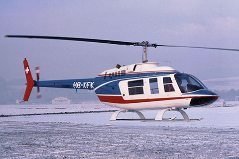 | HB-TIE and HB-ZRW of Rega a Untervaz - Photo by Roland Küng © 17-Jan-26 | HB-XFK of Transair SA at Bern - the 1st swiss Long Ranger - Photo by Paul Schüpbach © 3-Feb-76 |