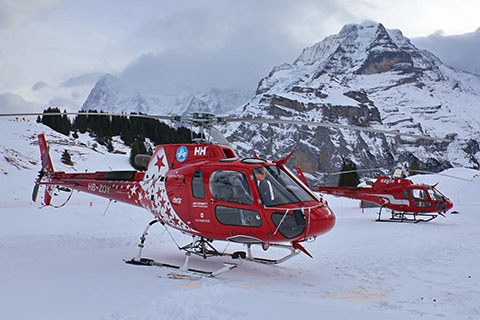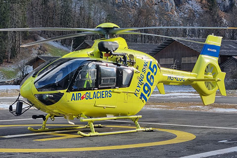 | HB-XSF (2) of Lions Air Skymedia AG at Bern-Belp - Photo by Janis Siegfried © 12-Dec-25 | HB-ZGA with Alpine Helicopters titles at Unterrothorn - Photo by Hans Zurniwen © 22-Feb-21 |