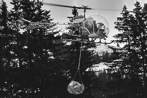 | HB-XBZ of Heliswiss with a load at the skid - Photo HBB via Roland Küng © 1966 | HB-XBZ of Heliswiss during work - Photo HBB via Roland Küng © 1966 |