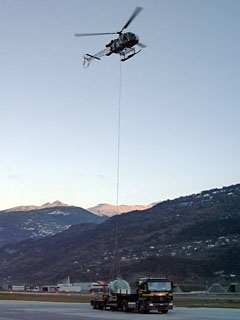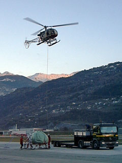 HB-XRF of Air Glaciers at Lauterbrunnen with free fly jumpers - Photo by Adrian Herzig © 12-Mar-00 | HB-XRF of Air Glaciers SA lifting HB-XEO on a truck at Sion - Photos by Ralf Tonezzer © 1-Dec-04 |