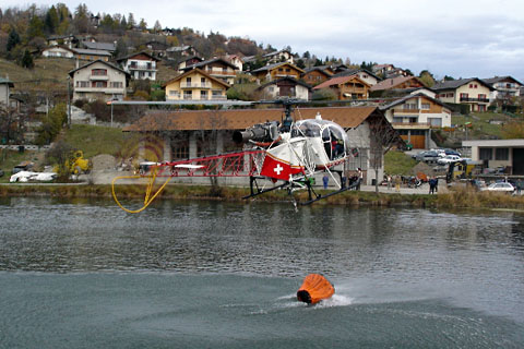 HB-XRF of Air Glaciers SA after sunset in the alps - Photo by Nicolas Fauchere © 23-Dec-04 | HB-XRF of Air Glaciers SA during fire fighting at Flanthey - Photo by Reynold Favre © 12-Nov-05 |