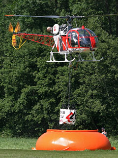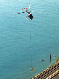 | HB-XTD of Heliswiss at work in the vineyards at Chexbres - Photo by Stephane Thomann © 25-Sep-01 | HB-XTD of Heliswiss at Gruyeres during a demo - Photo by Adrian Herzig © 13-Jun-03 - ANET |